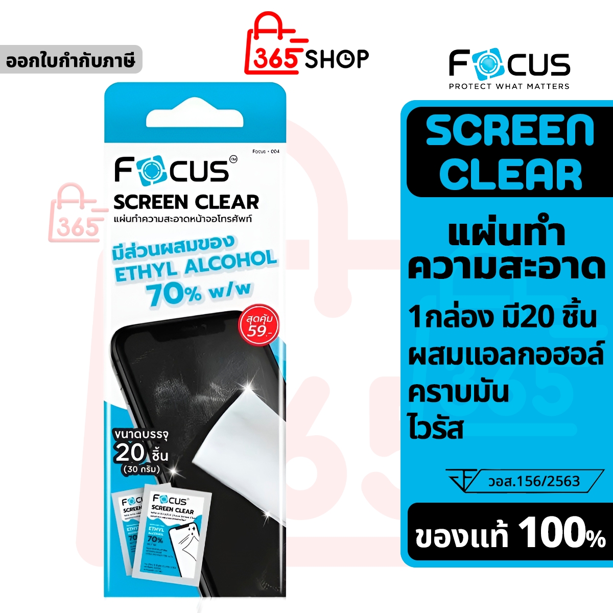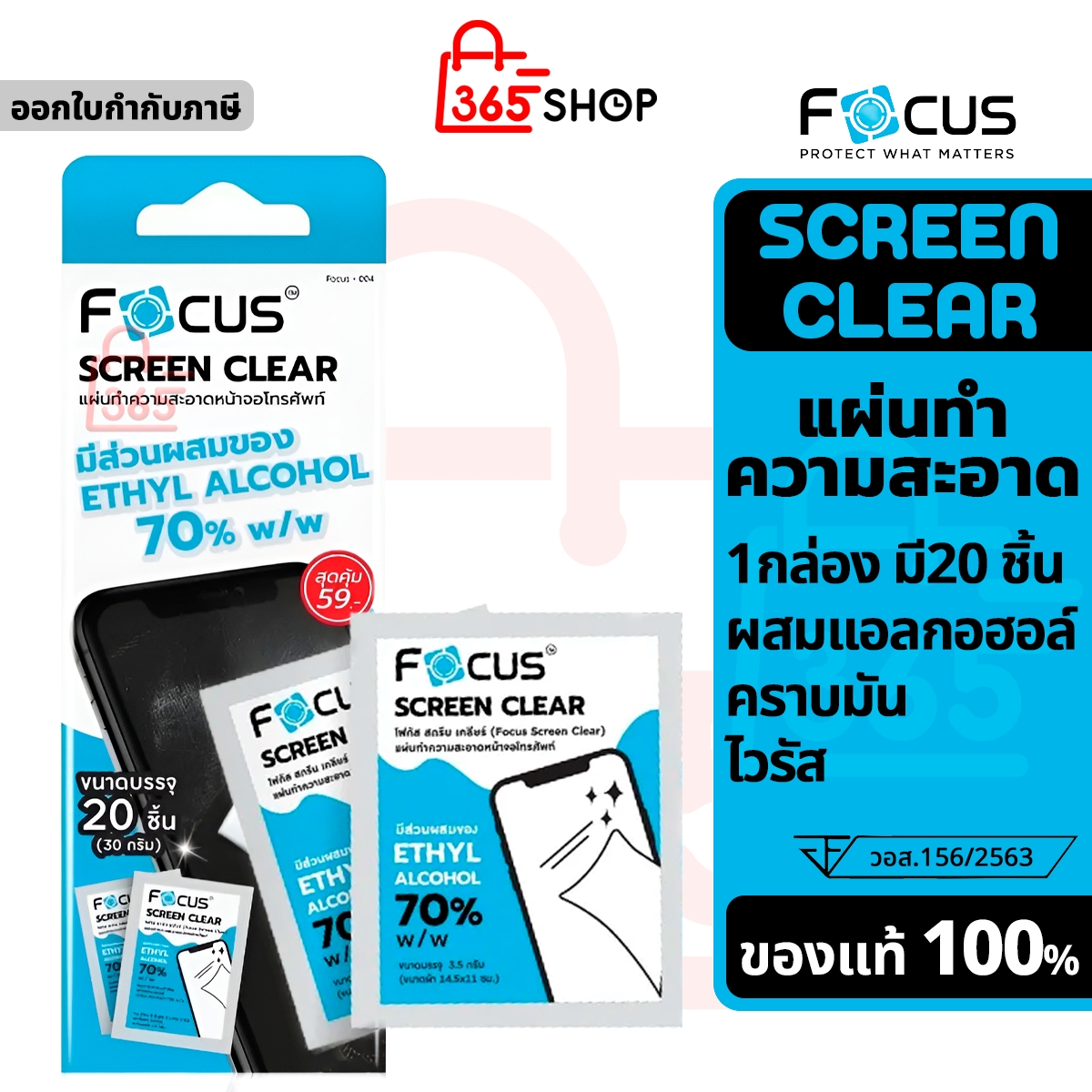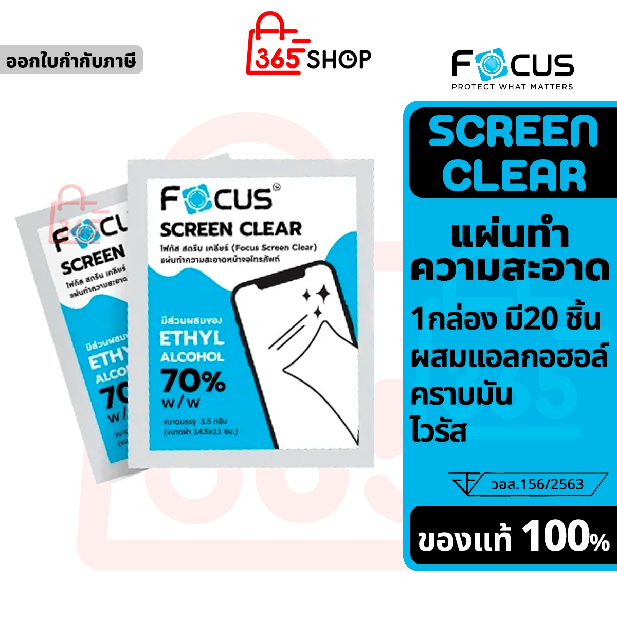 แผ่นทำความสะอาดหน้าจอมือถือ 1 กล่อง มี 20 แผ่น Focus Screen Clear